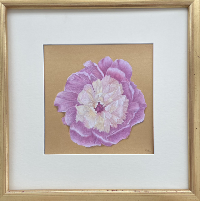 Original professional coloured pencil drawing with gold leaf background. Size framed 40x40cm. Beautiful gold frame.
